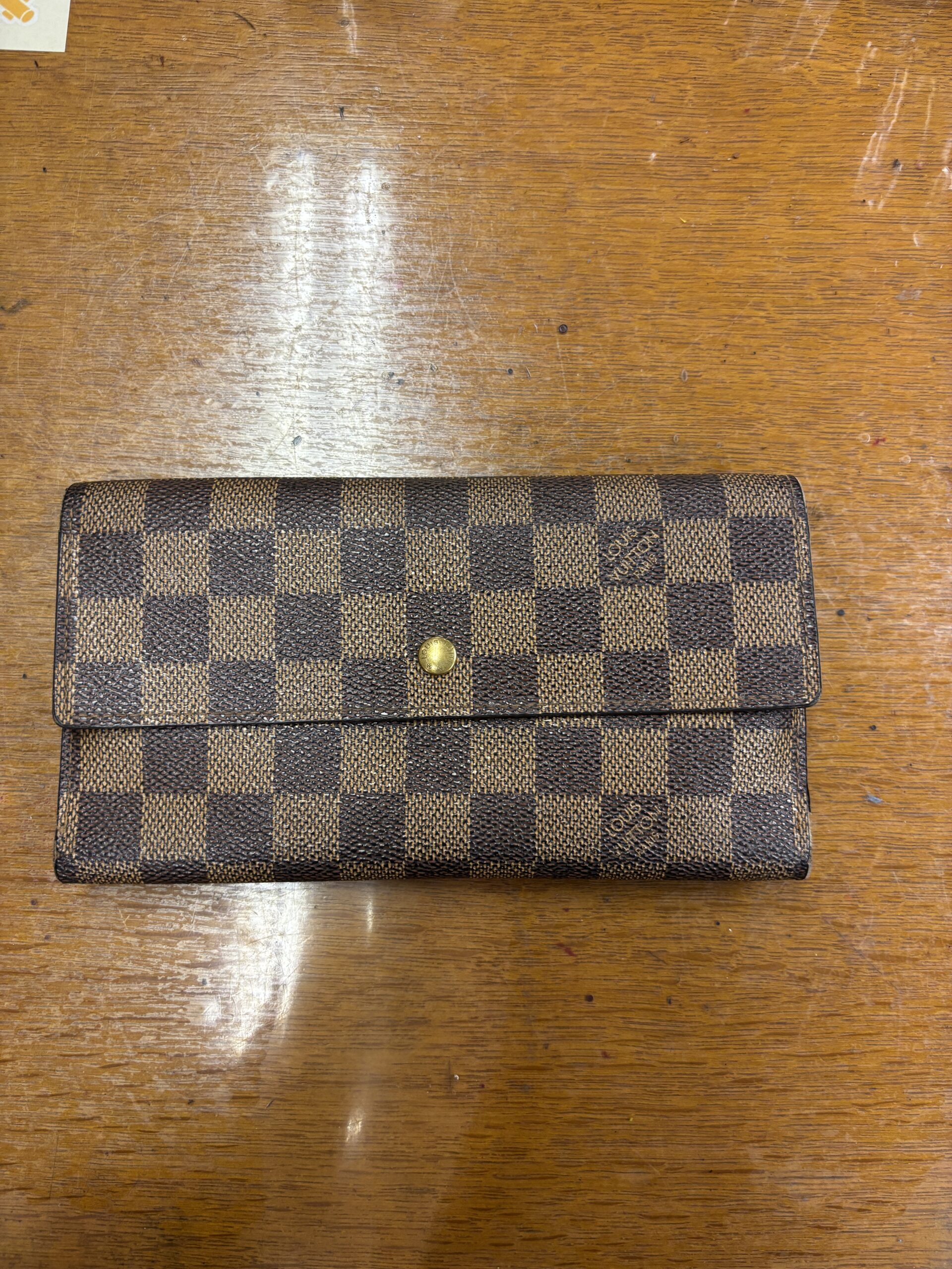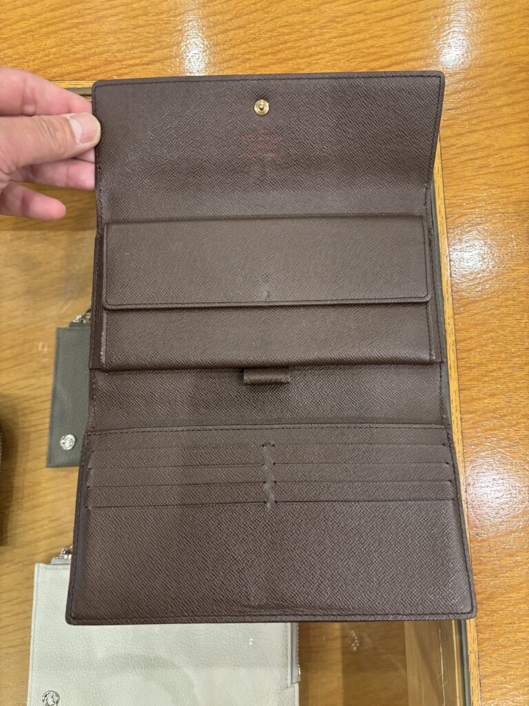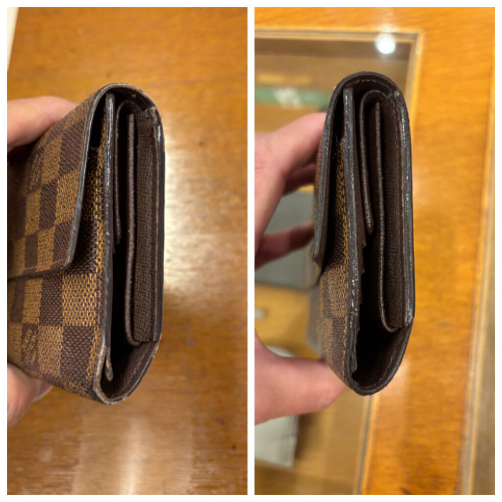ルイヴィトン(ダミエ)の長財布の補修のお持込みがありました。直営店修理の見積もりが高価だったり、状態によっては修理不能と判断されてしまうこともあったりでブランド修理のお持込みが多数あります。当店ではできるだけお客様のご希望やご予算に合わせて柔軟に対応させていただいています。今回はご相談の上で修理とメンテナンスに分けて承ることに致しました。