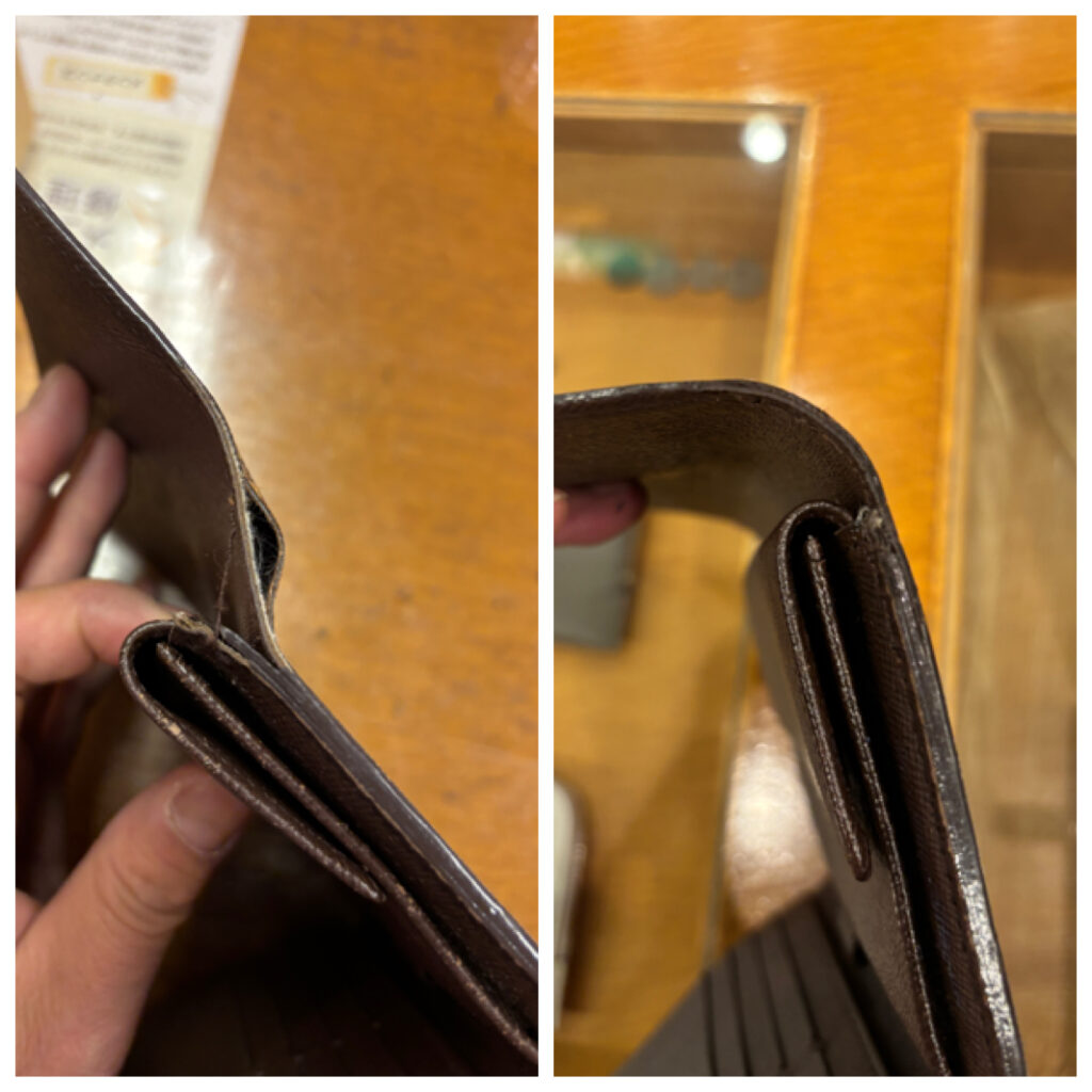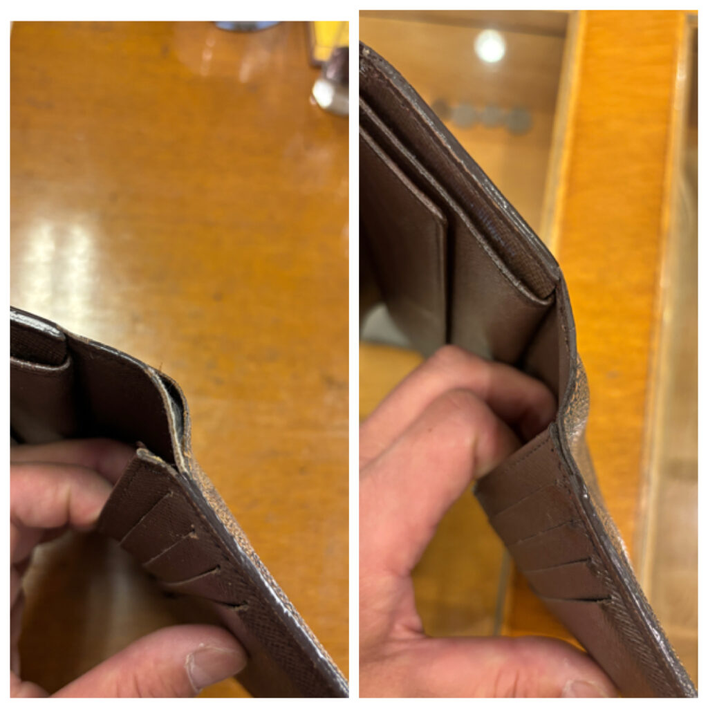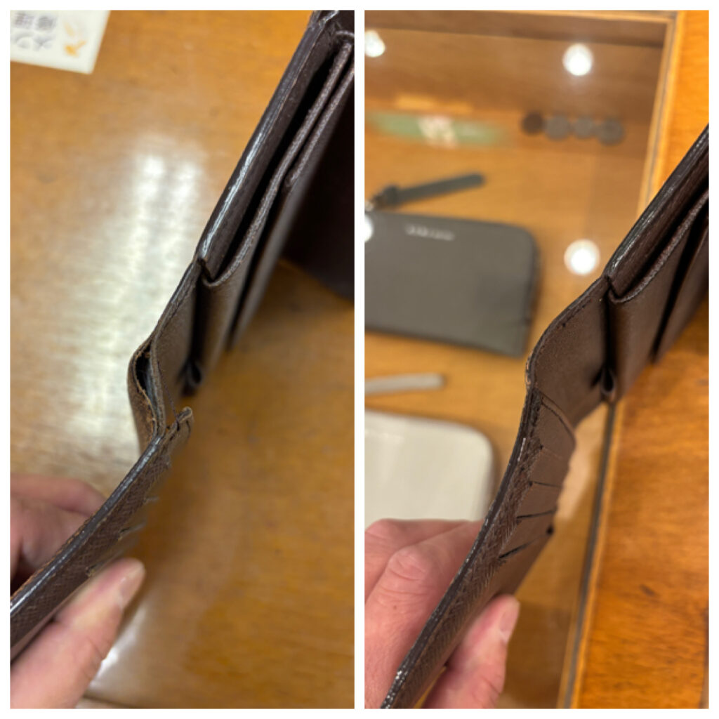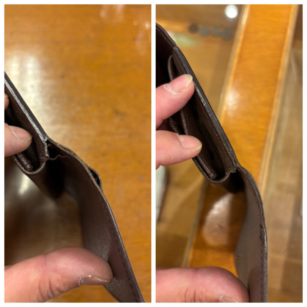 お財布を織り込み部分が左右共に傷みが激しく、解れ(ほつれ)が進んでいました。こういった症状はそのまま使っているとどんどん劣化が進み、素材(生地)が痩せてしまうと修繕に別素材の補強を入れないと直せない状態になってしまいます。今回はギリギリセーフだった為、補強財を足さなくとも縫い合わせができました。