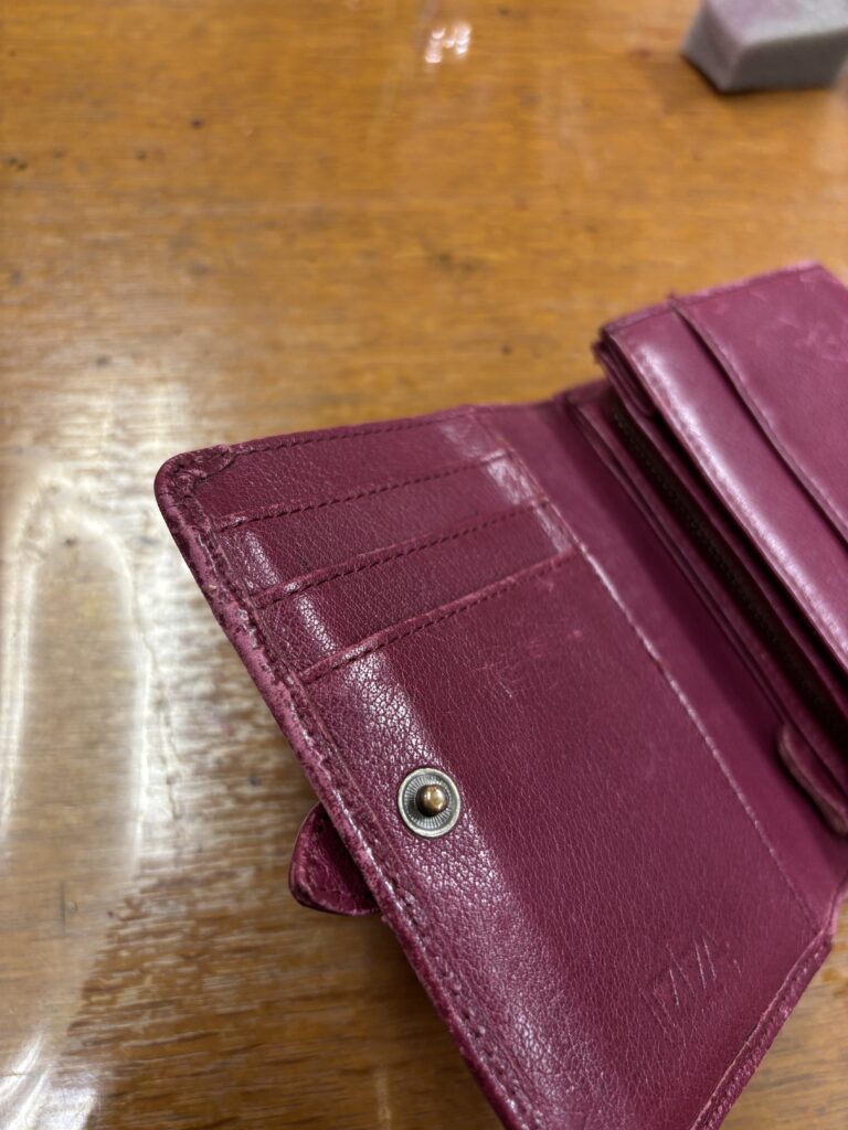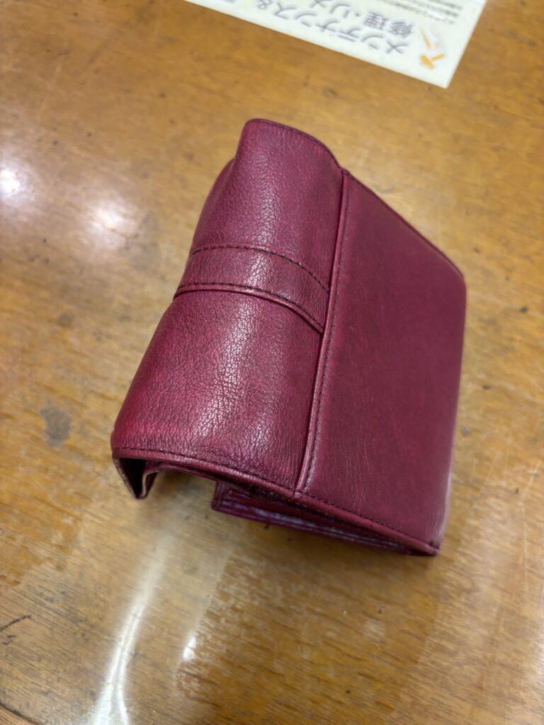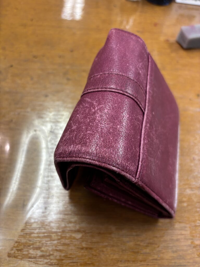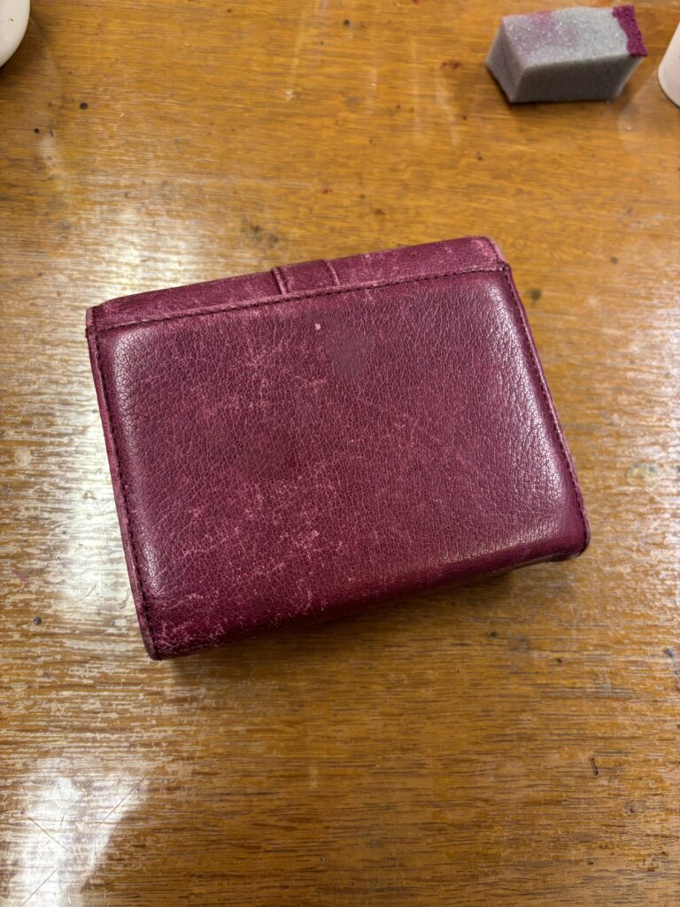 「店頭の看板を見てずっと気になってて、、」と赤いお財布をお持ち込み頂いたご主人、伺うと奥様がお嬢さんからずっと前にもらったプレゼントらしく、今後も使うのに少しでもキレイになったらとのご相談でした。最初は仕上がりイメージが湧かずご心配の様子でしたが、まだ使いたいというご希望ならこのままより絶対メンテナンスをした方がいいと強くお勧めし、お任せ頂きました。
