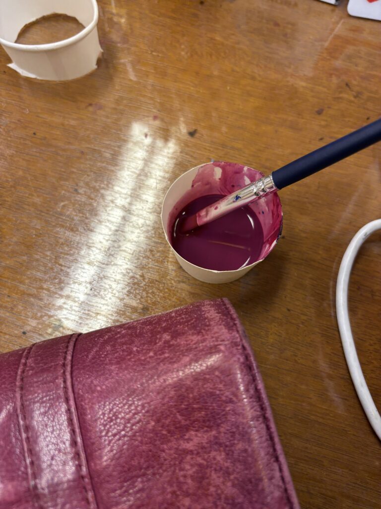 さて、革製品の補色において大事なのが「調色」という色をつくる作業です。いくつかの色を混ぜて製品の色を作り出すのですが、これが定まらないと全く進みません。マニュアルもなく溶剤の色数も限られている上、当店に美大卒スタッフがいる訳もございません、、、只々地道に経験則に基づいて調合していきます。今回は少し紫寄りの赤色なので赤に青を少しずつ混ぜながら確かめます、、、、割と早めに上手くいってホッ(^○^)