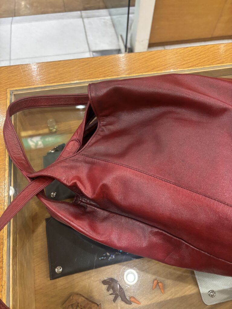 元は深い赤茶色だったというバッグが現在は薄い小豆色に変化しており、オイルさえ加えてあげればこれはこれで優しい良い色だなとも思いましたが、せっかくお任せされたので全体の補色を施すことにしました。目指すは元より明るめのボルドーです!