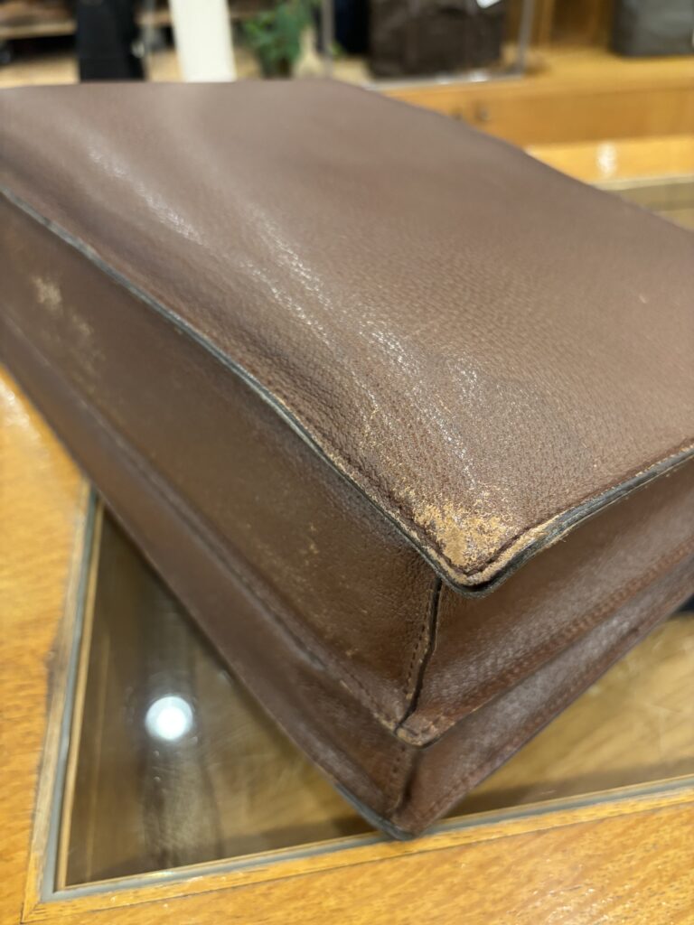かぶせ型革製仕事カバンの補色ご依頼をいただきました。こういったオーソドックスな鞄は職人さんの減少でどんどん市場に少なくなってきていますので、お好きな方は大事にメンテナンスして延命していきたいですよね。