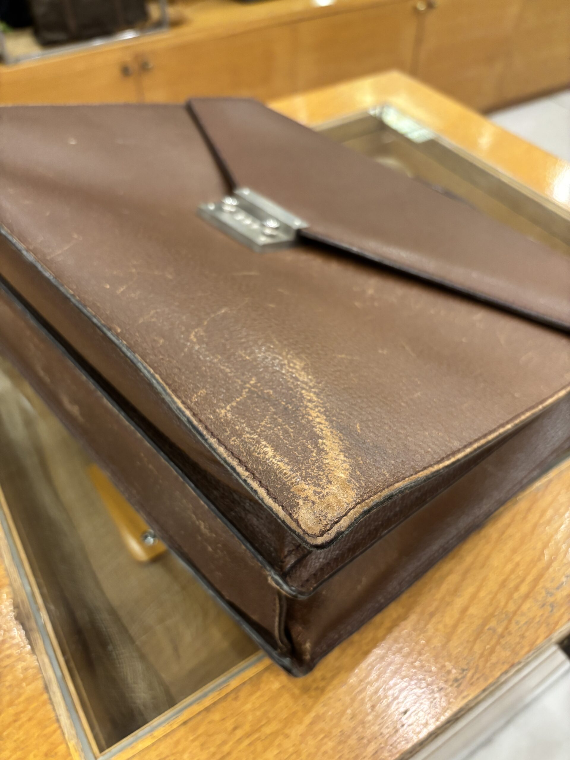 かぶせ型革製仕事カバンの補色ご依頼をいただきました。こういったオーソドックスな鞄は職人さんの減少でどんどん市場に少なくなってきていますので、お好きな方は大事にメンテナンスして延命していきたいですよね。